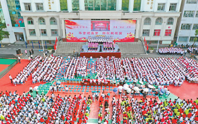 国庆假期,湖北省南漳县实验中学师生齐唱红歌。