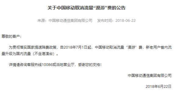 为贯彻落实国家提速降费政策,自2018年7月1日起,中国移动取消流量“漫游”费,新老用户省内流量升级为国内流量(不含港澳台)。