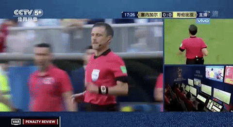 第17分钟,塞内加尔断球后打出一波进攻,马内突入禁区被哥伦比亚球员碰倒,主裁判判罚点球。但他到场边观看了视频回放之后,改判取消了点球。