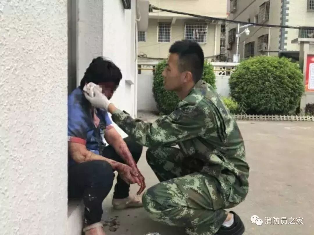 正在午休的消防员闻讯快速赶到事发现场,找到了全身鲜血淋漓蜷缩在路边的保洁阿姨,为她擦拭血迹,并及时送往医院。