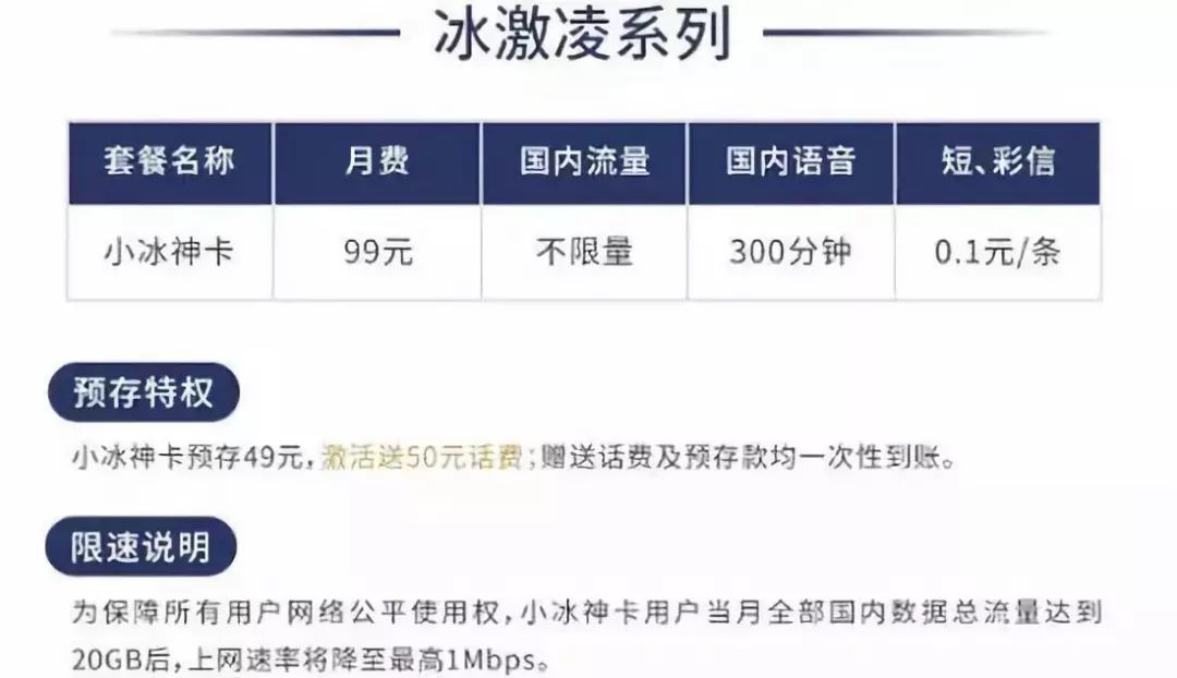 △联通冰激凌套餐,当月国内上网流量达到20GB以后,上网速率降至1Mbps。