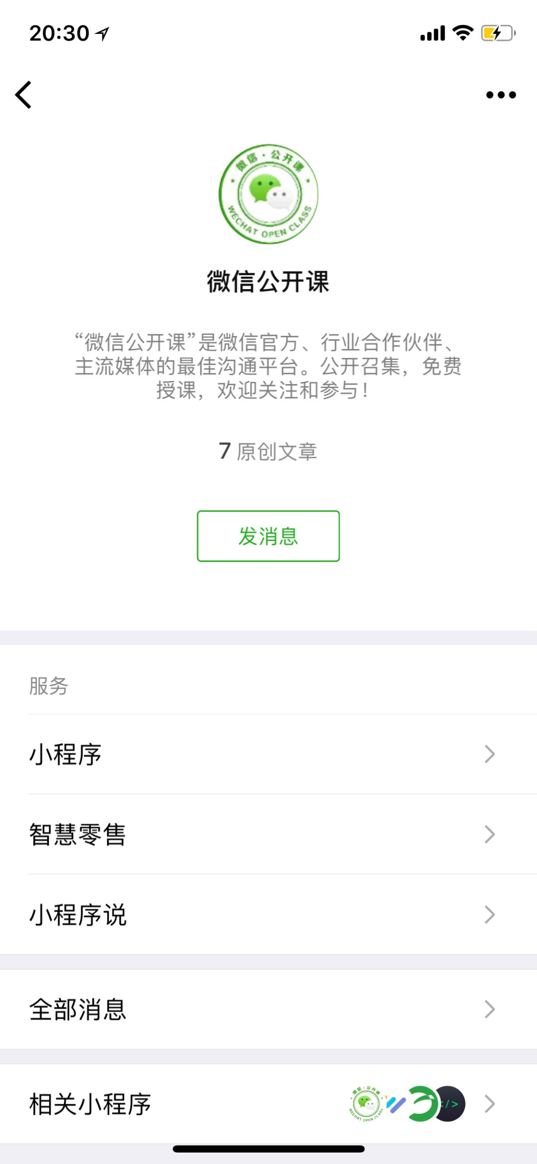 订阅号和服务号的资料介绍页面也有一些变化,分为基本信息区域和内容区域(或服务区域),增加了原创文章篇数,内容区域则展示公众号的3条消息。