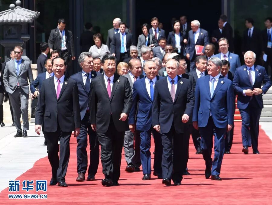 △2017年5月15日,“一带一路”国际合作高峰论坛在北京雁栖湖国际会议中心举行圆桌峰会,国家主席习近平主持会议并致辞。这是第一阶段会议结束后,习近平同与会领导人和国际组织负责人步出雁栖湖国际会议中心。
