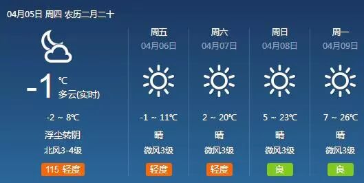 后天(4月8日),晴,气温5到23度。