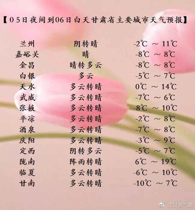 明天(7日)夜间到后天(8日)白天,全省各地晴或多云;另外,清晨除陇南市南部外,全省各地有霜冻。