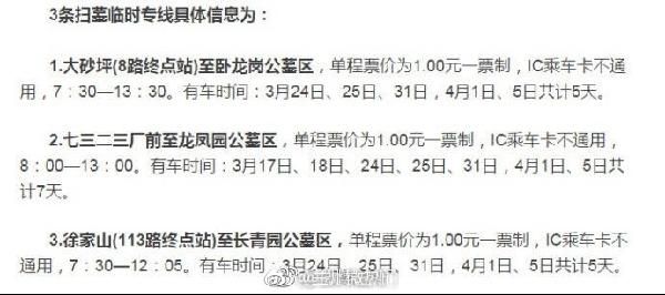 七三二三厂前至龙凤园公墓区,单程票价为1.00元一票制,IC乘车卡不通用,8:00—13:00。有车时间:3月17日、18日、24日、25日、31日,4月1日、5日共计7天。