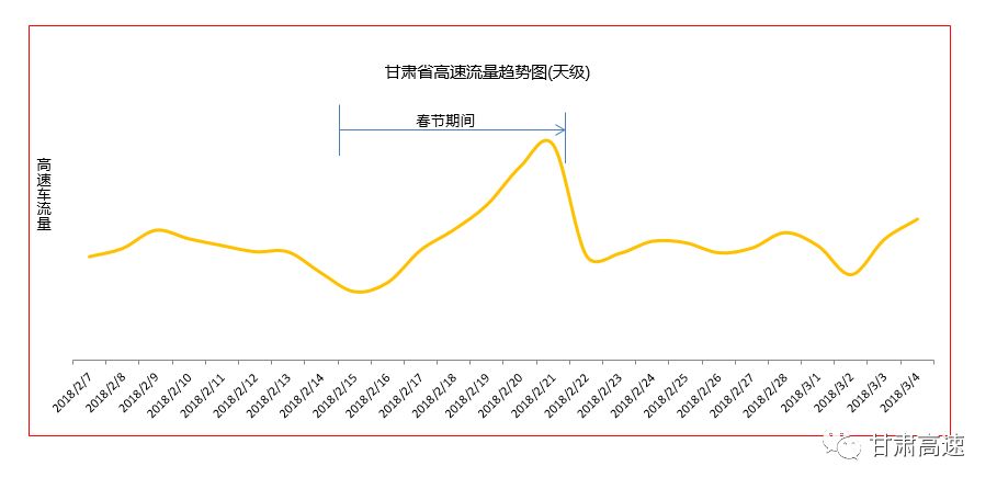 *春节期间甘肃省高速流量趋势为:高速出程车流高峰为2月9日,高速返程车流高峰为2月21日。