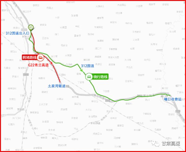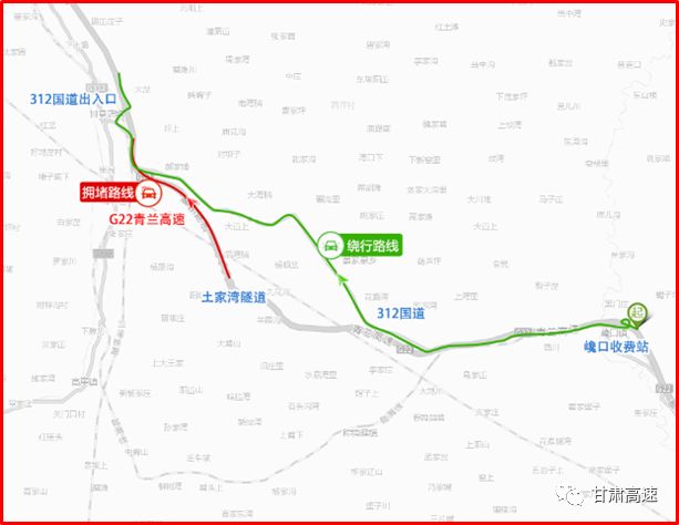 预计春节返程G22青兰高速(土家湾隧道- 312国道出入口)易拥堵。建议错峰出行或选择如下绕行路线。