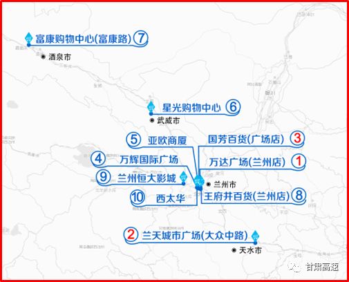 *自驾导航热门景点预计有:莫高窟景区、金城公园、麦积山风景名胜区、崆峒山国家地质公园、五泉山公园、拉卜楞寺、张掖丹霞国家地质公园、嘉峪关文物旅游景区、伏羲庙、兰州新区长城影视基地;自驾导航热门商场预计有:万达广场(兰州店)、兰天城市广场(大众中路)、国芳百货(广场店)、万辉国际广场、亚欧商厦、星光购物中心、富康购物中心(富康路)、王府井百货(兰州店)、兰州恒大影城、西太华。