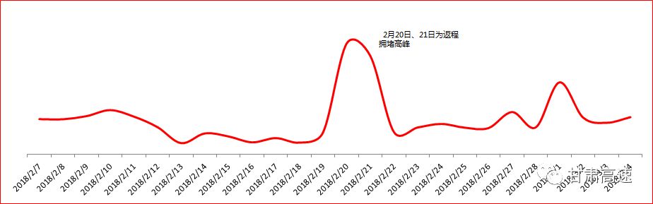 预计高速出程车流在2018年2月9日当天达到峰值,除夕夜为最低值,高速返程车流在2月21日达到峰值。21日后,流量趋势恢复到正常趋势状态。