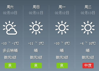 10日夜间到11日白天,晴,气温-11到3度;