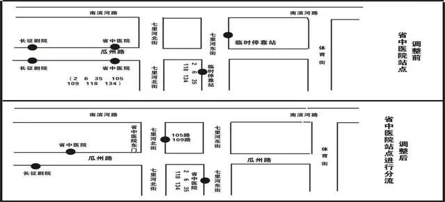 1. 调整2路、6路、35路、105路、109路、118路、134路,7条公交线路在“省中医院”站点停靠位置:
