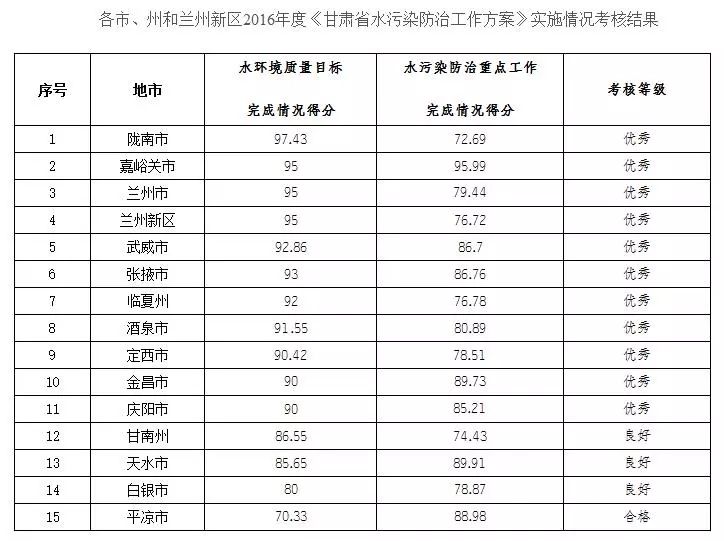 12月20日,记者从省环保厅了解到,日前,经报省政府同意,省水污染防治领导小组办公室公布了各市(州)和兰州新区2016年度《甘肃省水污染防治工作方案》实施情况考核结果。