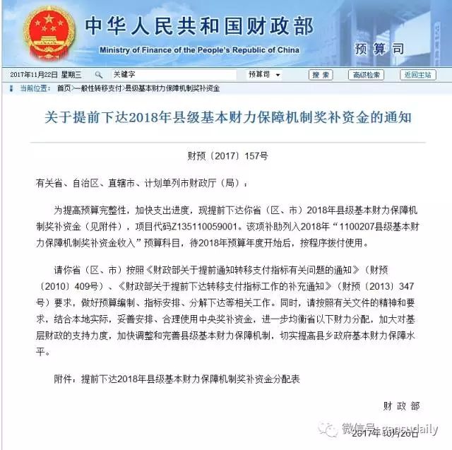 11月20日,财政部发布《关于提前下达2018年县级基本财力保障机制奖补资金的通知》拿出1567.23亿奖补资金