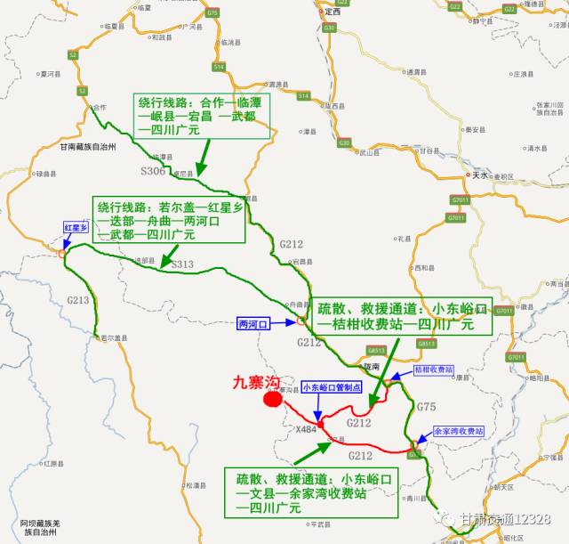 1、由九寨沟、文县方向入川的车辆(疏散、救援通道):请沿G212线(小东峪口—文县—余家湾)—G75兰海高速(余家湾—四川广元)或G212线(小东峪口—桔柑)—G75兰海高速(桔柑—四川广元)行驶;