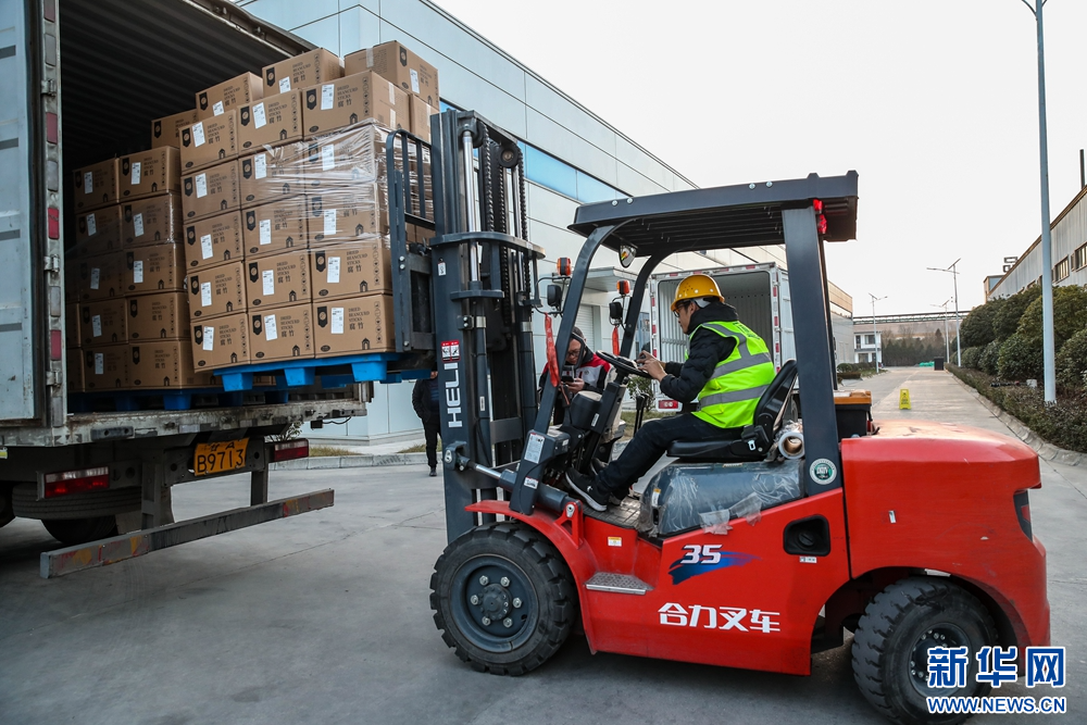 1月28日,在河北省平山县西柏坡镇北庄村电商直播助农惠农展销基地,工作人员展示特色商品。新华社记者骆学峰摄