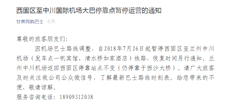 西固区至中川国际机场大巴停靠点暂停运营的通知