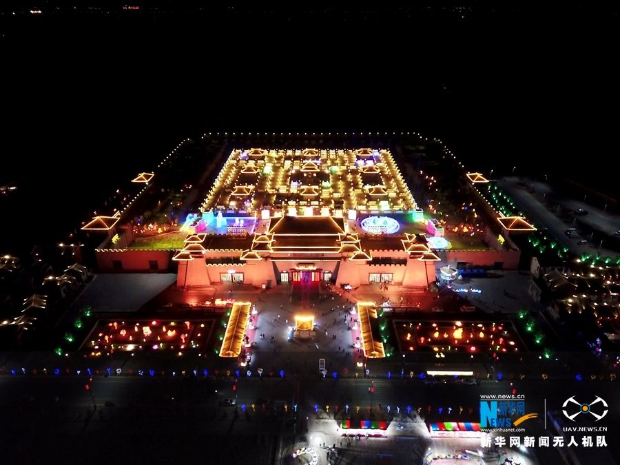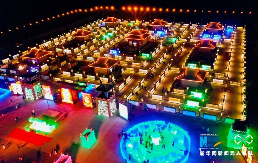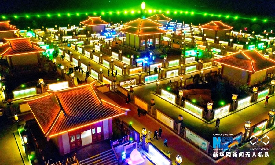 这是近日在甘肃省张掖市甘州区碱滩镇屋兰古镇航拍的“九曲黄河灯阵”。新华网发(王将摄)