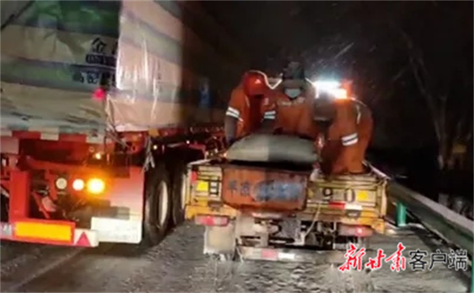 交警部门配合公路部门清扫道路积雪,铺洒防滑料。