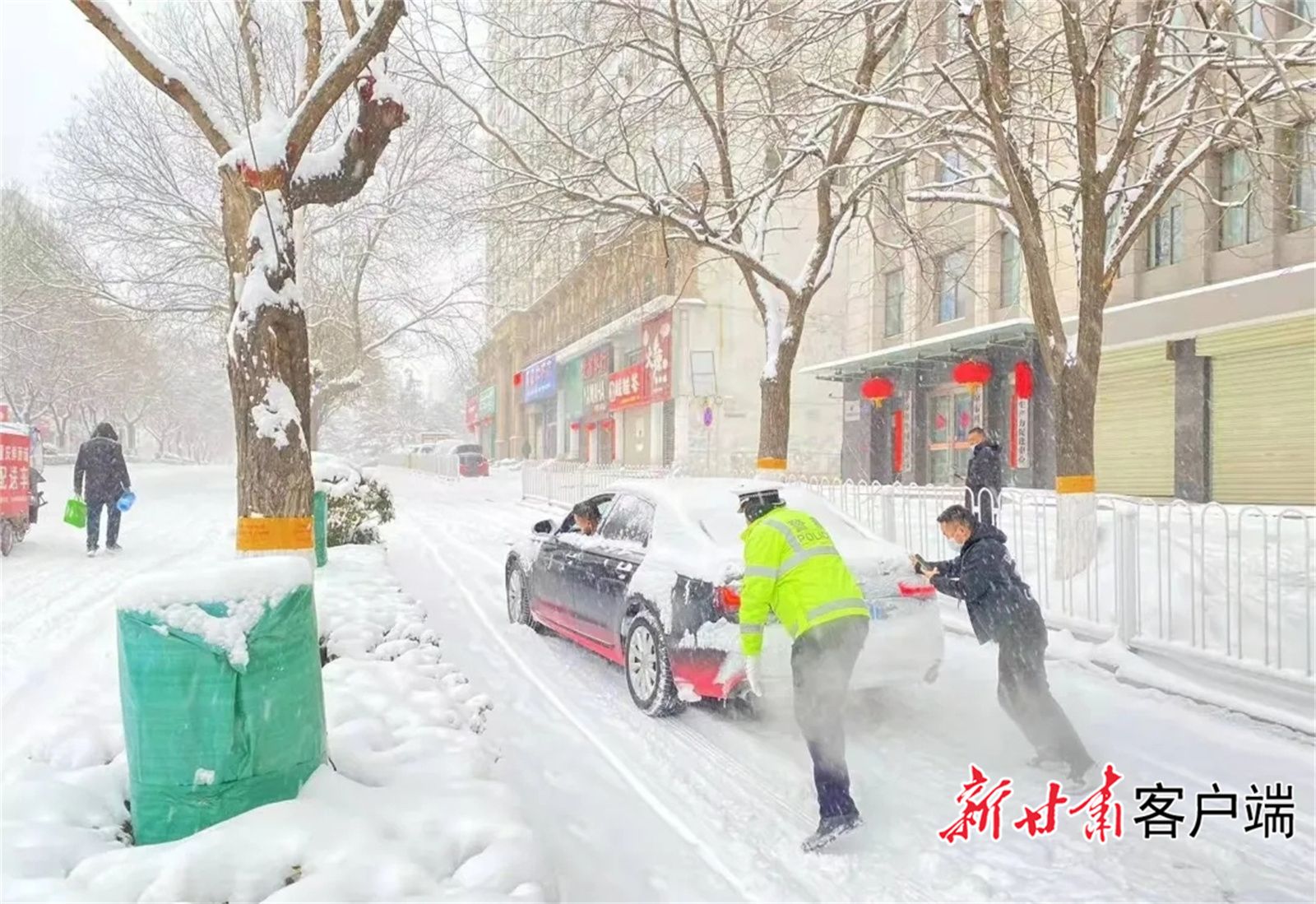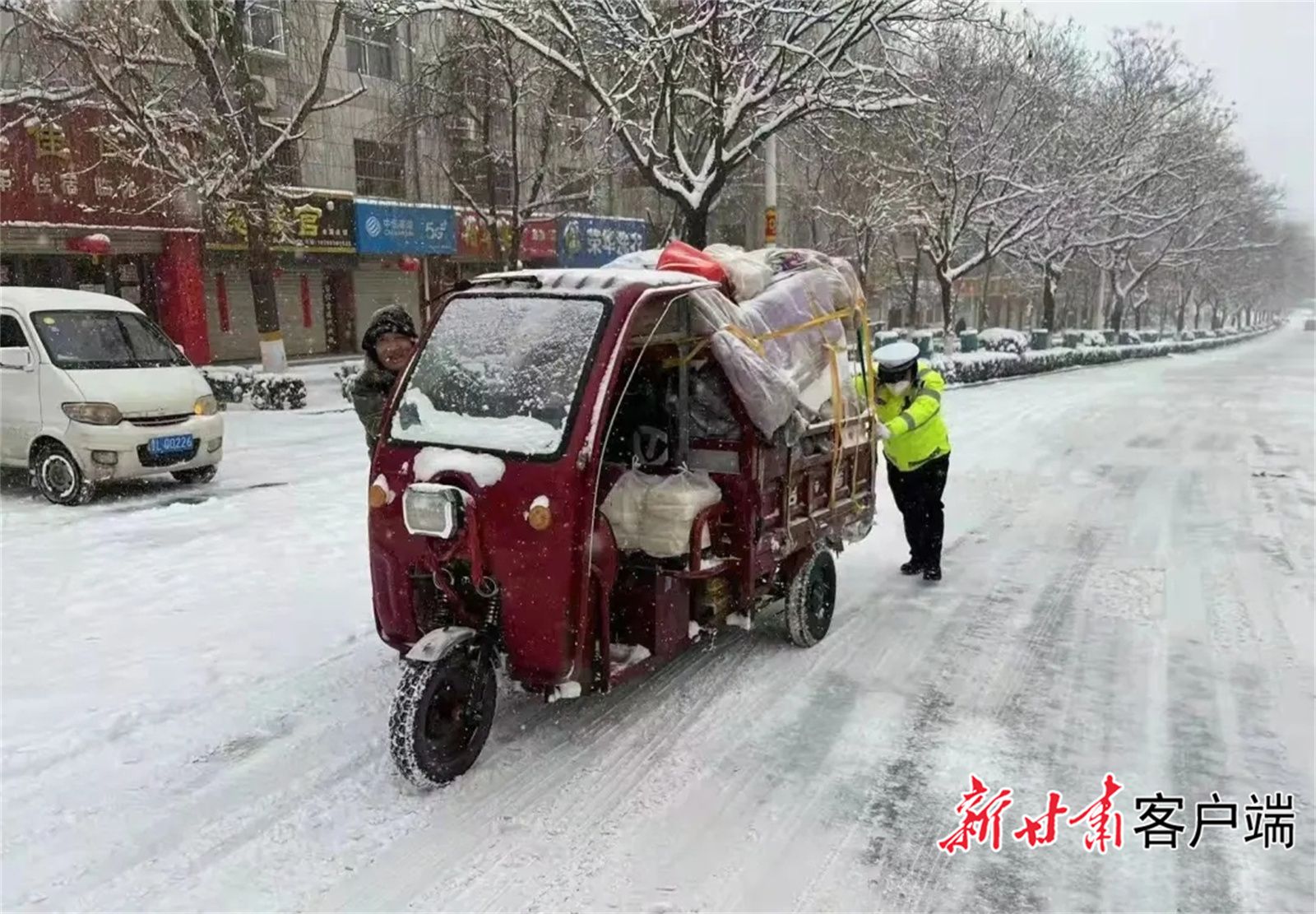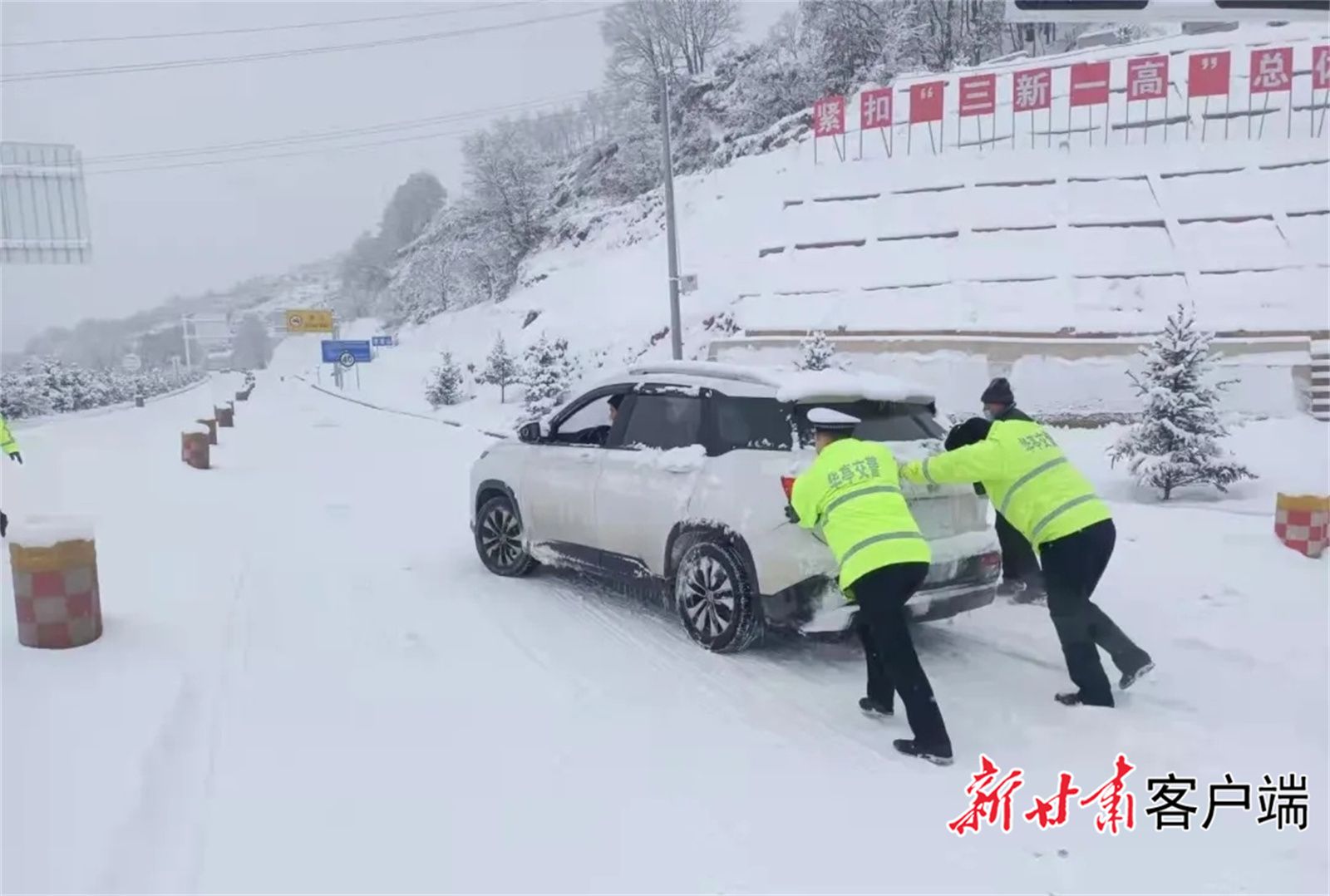 街头、国省道上,交警助力打滑车辆前行。
