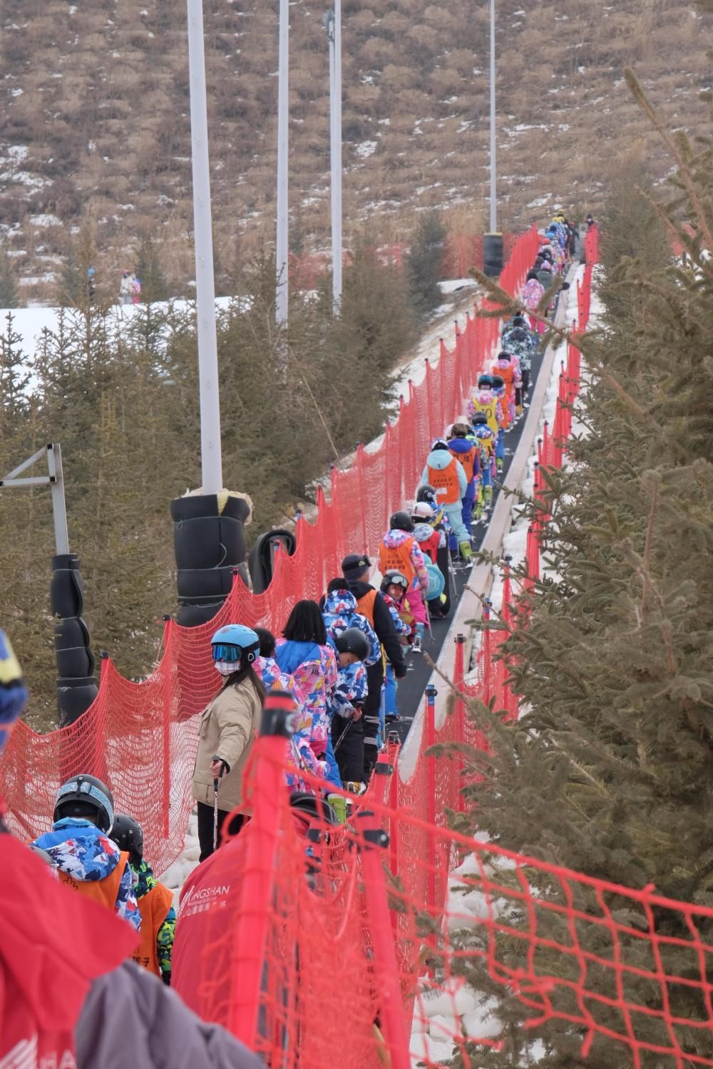 在龙山国际滑雪场内,练习滑雪的孩子们在传送带上排成长队。新华社记者 王紫轩 摄
