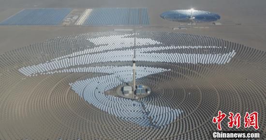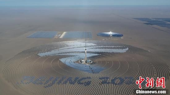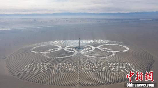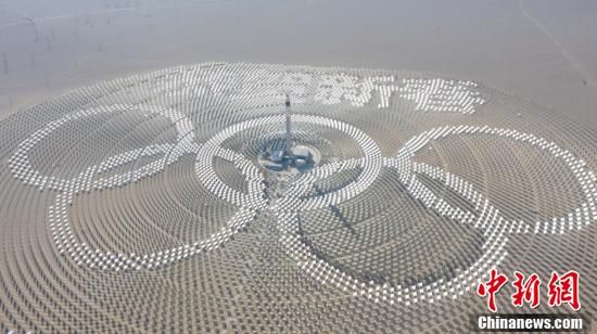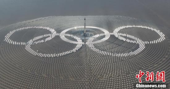 甘肃省敦煌市,首航高科敦煌100兆瓦熔盐塔式光热电站拼出两千多米宽的奥运五环。邱亮摄