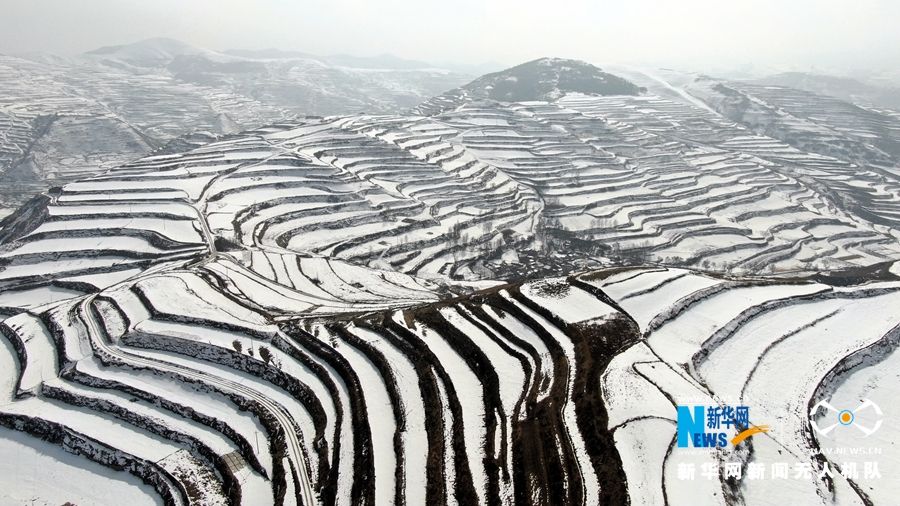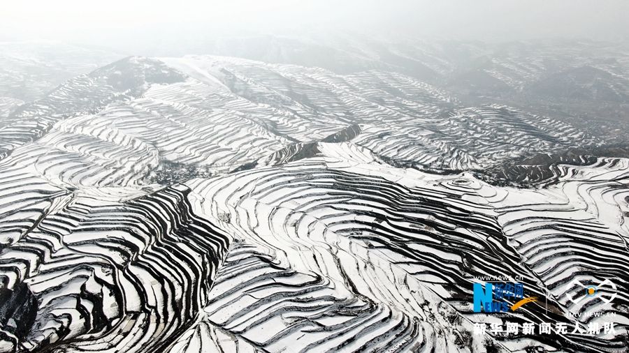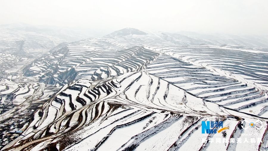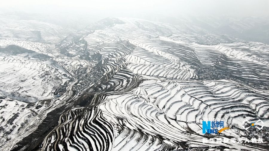这是2月12日航拍的甘肃省陇南市宕昌县木耳乡木耳梁梯田雪景。新华网发(刘辉摄)