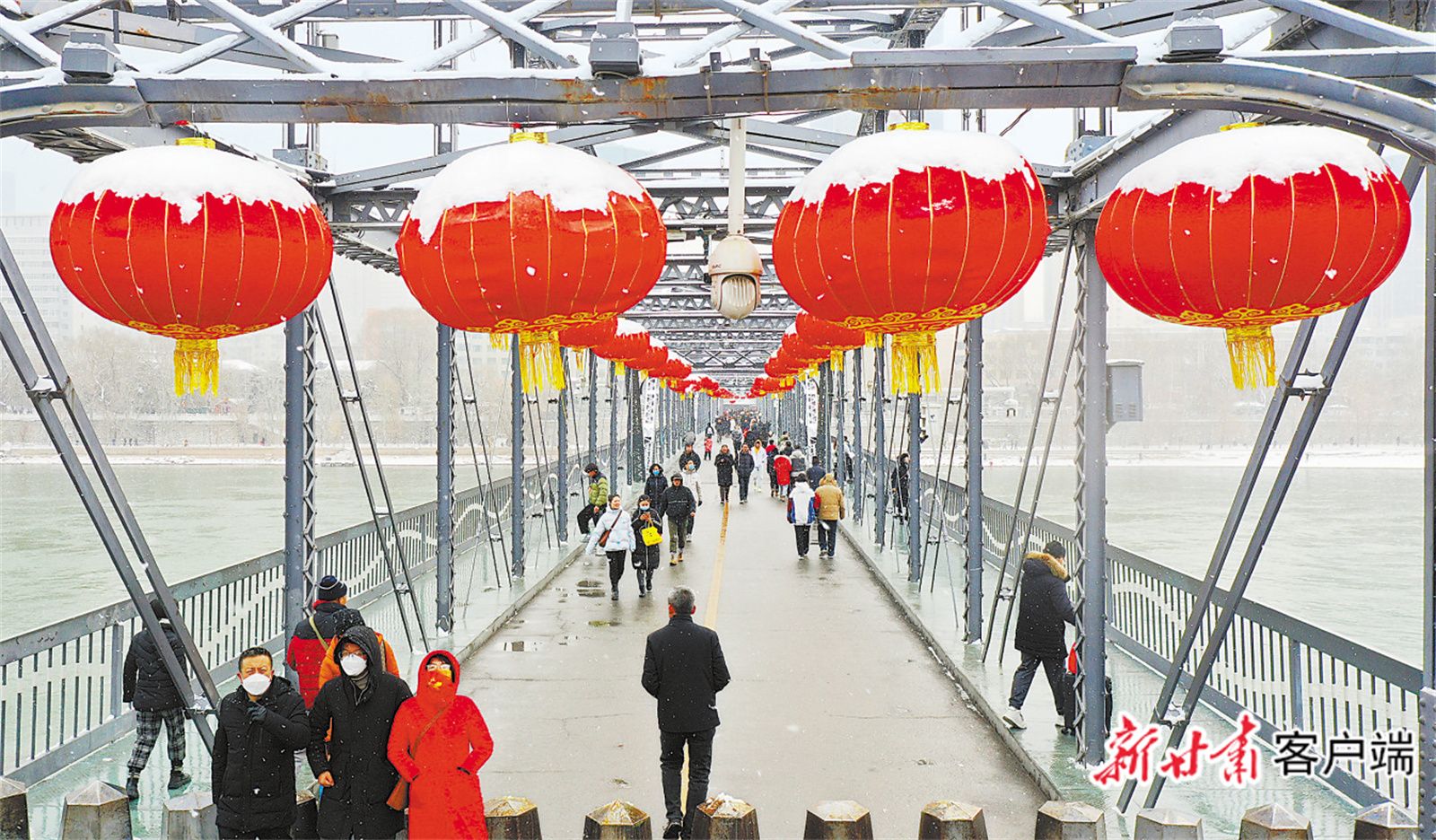 春雪中的兰州中山铁桥年味十足。新甘肃·甘肃日报记者 盛学卿