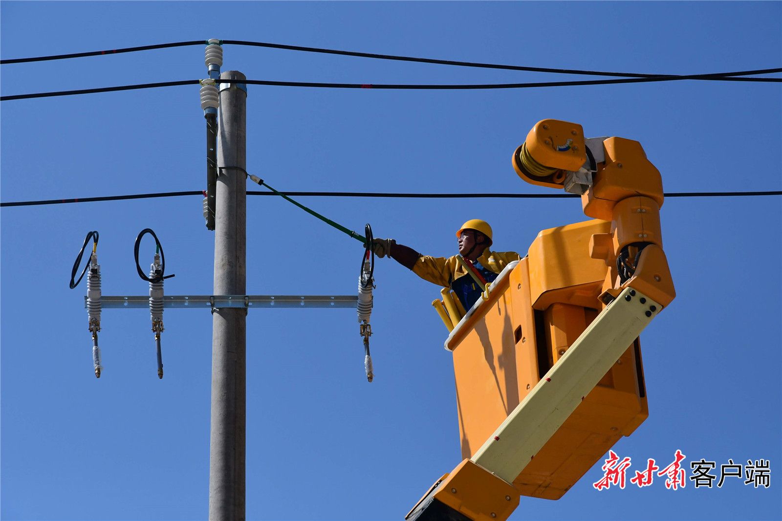 “用手抓住一万伏带电导线,准备剥除绝缘层作业时,电流引起导线的强烈颤动让我头皮发麻。”国网兰州供电公司配网中心带电作业组组长宋军光给前来参观的记者讲述他第一次开展带电作业的情景。在他身后,正缓缓升起斗臂车,4名身穿工作服的电工从检查作业环境到作业装备,再到登上斗臂车进行作业全程相互配合,完成带电作业演练展示。记者们一边听着宋军光对整套带电作业流程的讲解,一边看着后面的“不停电作业”实操演练。