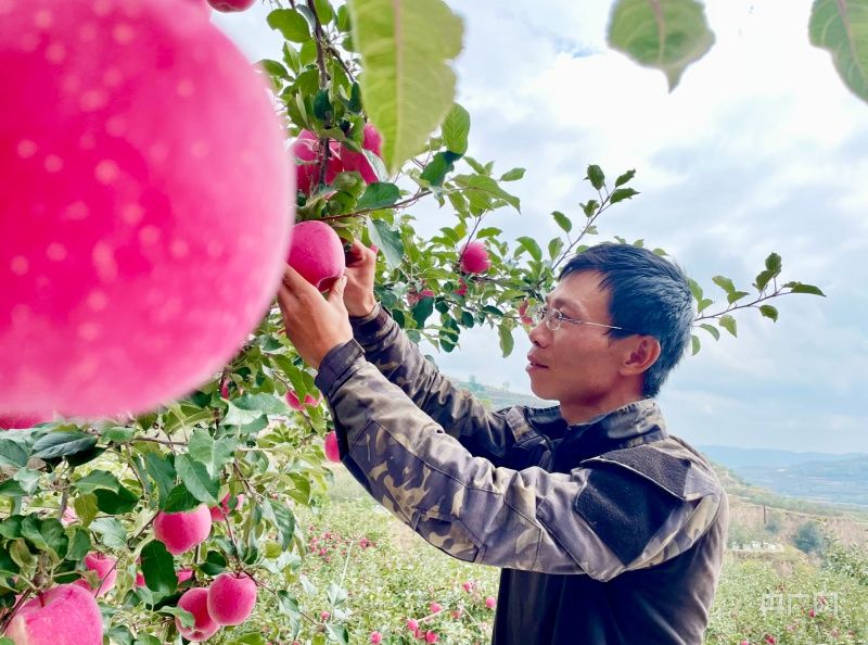 果农黎兴旺正在采摘苹果(央广网发 马丽丽 摄)