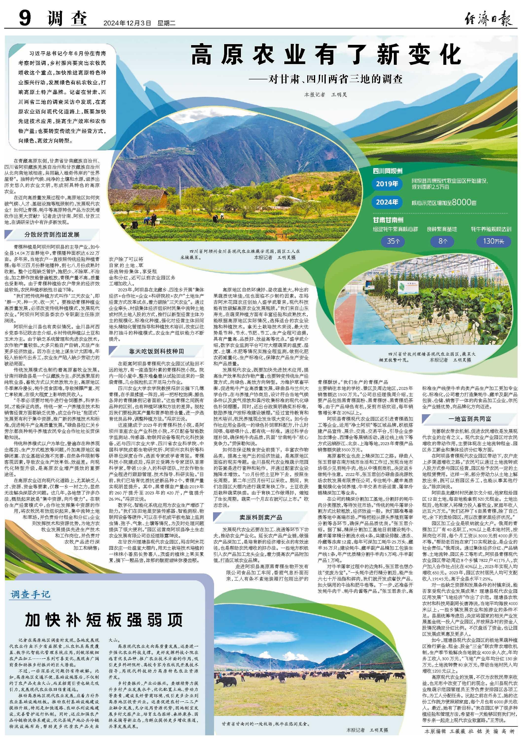 在迈向高质量发展过程中,高原地区如何突破气候、人才、基础设施等瓶颈制约,发展现代农业?如何让青稞、牦牛等高原特色产品为农民增收作出更大贡献?记者走访甘南、阿坝、甘孜三地,在调研采访中有许多新发现。