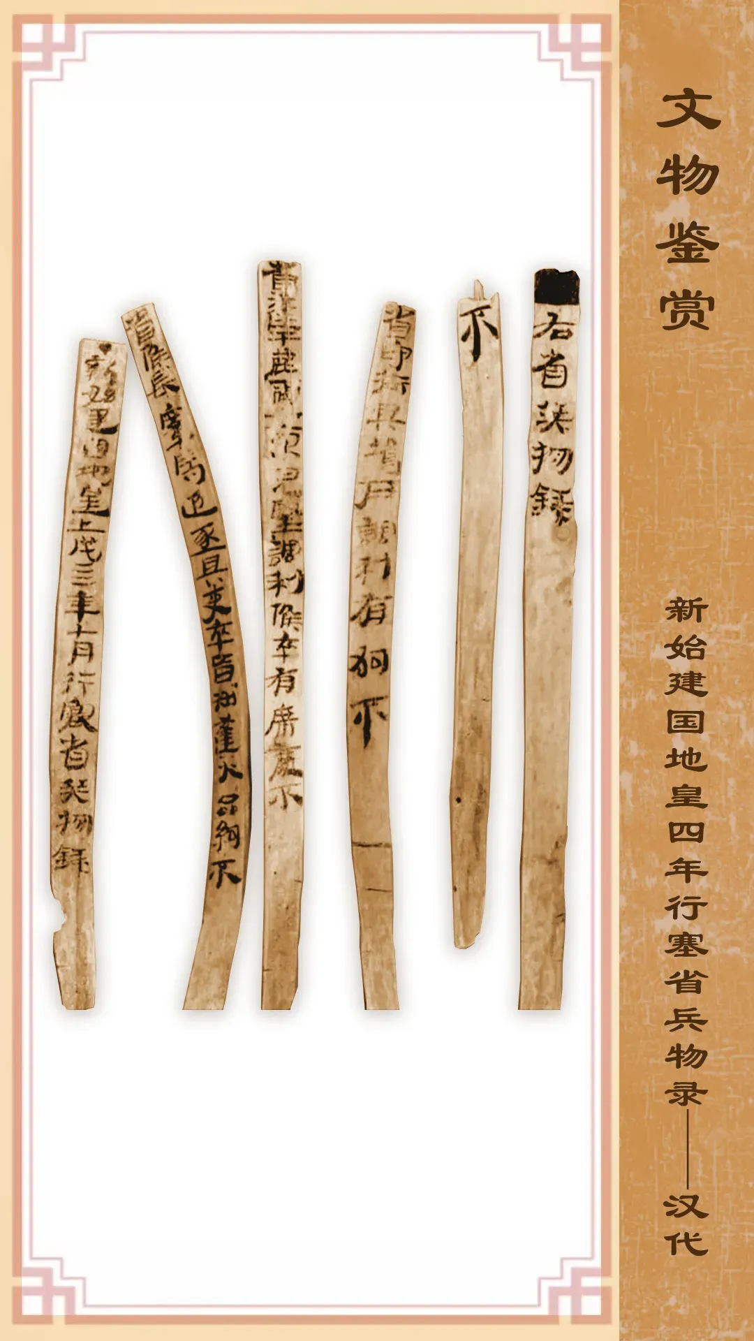 此简1974年出土于甲渠候官第22号房址内,呈木简6枚,下部变形残断,长16-22厘米不等,宽1.2 厘米。内容为检查部、隧守御器具和吏卒烽火品约知识的记录。该简册的出土,为研究王莽时期居延边塞的守御器种类、兵器装备以及平时的检查制度提供了翔实具体的实物资料,有重要价值。现藏甘肃简牍博物馆。
