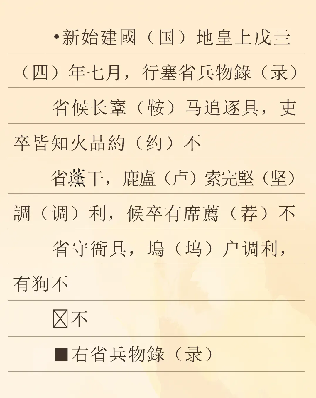 该简册名为《新始建国地皇四年行塞省兵物录》,简文所言“行塞”是指上级部门视察边塞亭隧的各项工作,是上级部门对所属下级部门的一种督察制度。从相关简文记载可知,这种督察制度主要有行塞举、行塞省和行塞劳等三种。
