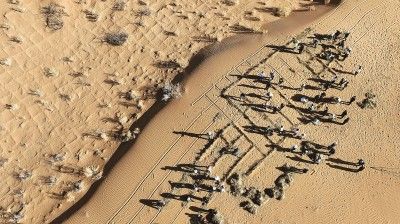 2024年4月,在甘肃省张掖市临泽县北部荒漠防沙治沙区,河西学院的大学生们在林草工作人员的指导下用麦草压沙障。 新甘肃·甘肃日报通讯员 王将摄