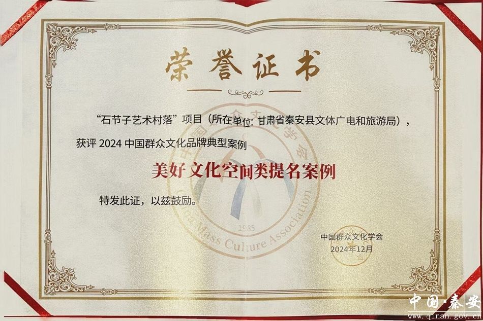 12月23日,2024中国群众文化品牌发展大会在上海市奉贤区九棵树未来艺术中心举行。经过层层筛选和激烈角逐,秦安县叶堡镇石节子艺术村落凭借其独特的艺术魅力和文化内涵,在全国各地90个群众文化品牌典型案例中脱颖而出,入选2024中国群众文化品牌典型案例——美好文化空间类提名案例。秦安县委常委、宣传部部长马昊莹在大会上做了宣传推介。