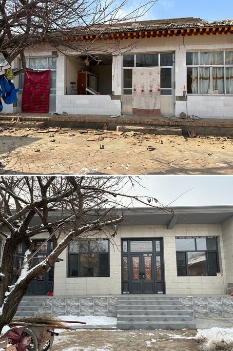 拼版照片:上图为记者在积石山6.2级地震后拍摄到的甘肃省临夏回族自治州积石山县刘集乡高李村村民马而立被损毁的房屋(2023年12月19日摄);下图为时隔近一年,记者拍摄到的在政府扶持下马而立建起的新房(2024年12月11日摄)。新华社记者 张文静 摄