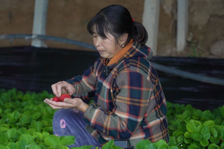 在青海省海东市民和回族土族自治县巴州镇的避险搬迁安置点周边建有许多蔬菜大棚,搬迁村民可以选择承包或在大棚里务工。图为12月11日,大棚老板柯冬莲在采摘草莓。新华社记者 柳泽兴 摄