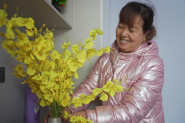 12月11日,在位于青海省海东市民和回族土族自治县巴州镇的避险搬迁羊羔滩集中安置点,搬迁户杨丽儿正在装扮新家。新华社记者 柳泽兴 摄