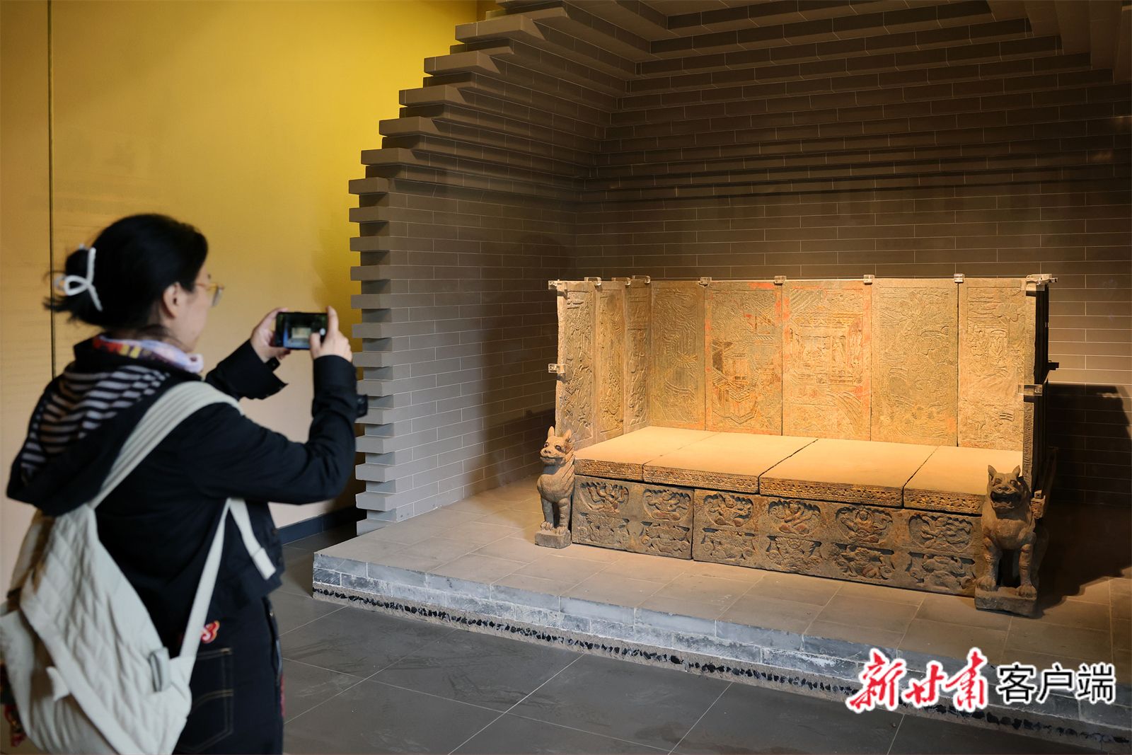 游客拍照打卡天水市博物馆隋唐时期的文物——贴金彩绘围屏石榻。