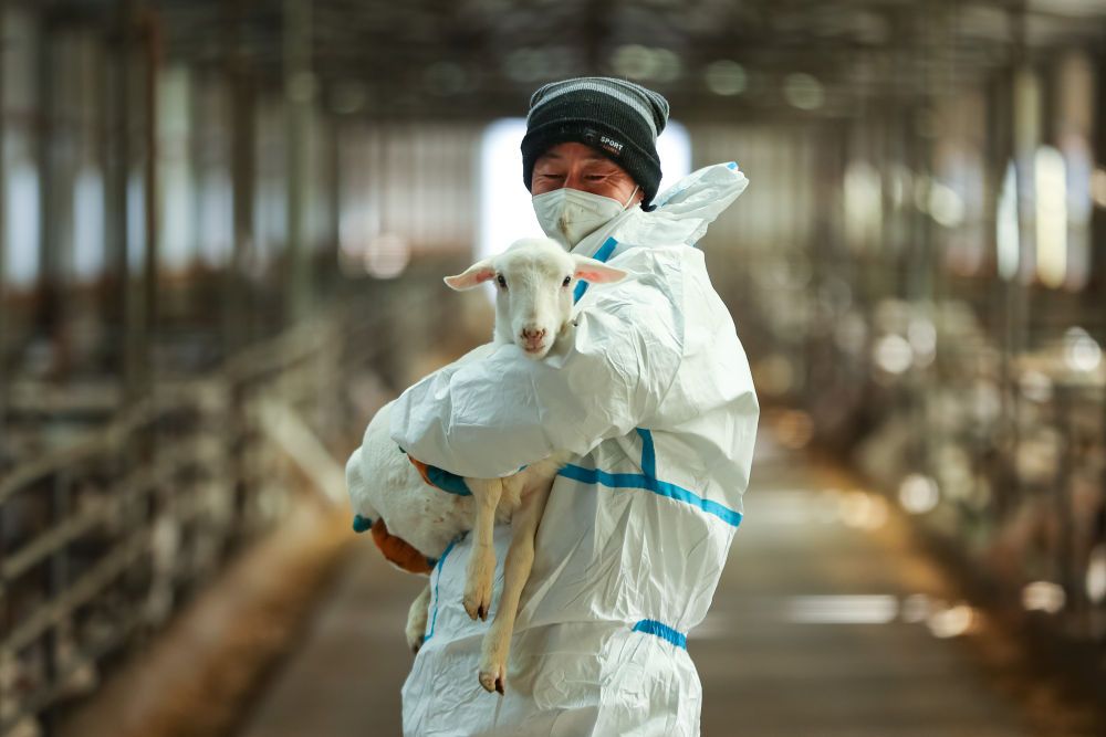 1月9日,在杨文斌的肉羊养殖合作社,农民抱着新品种羊羔。新华社记者郎兵兵 摄