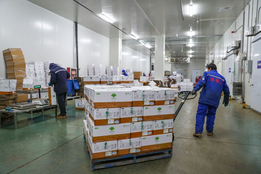1月8日,在环县中盛羊业加工车间,工作人员转运羊肉准备发货。 新华社记者郎兵兵 摄