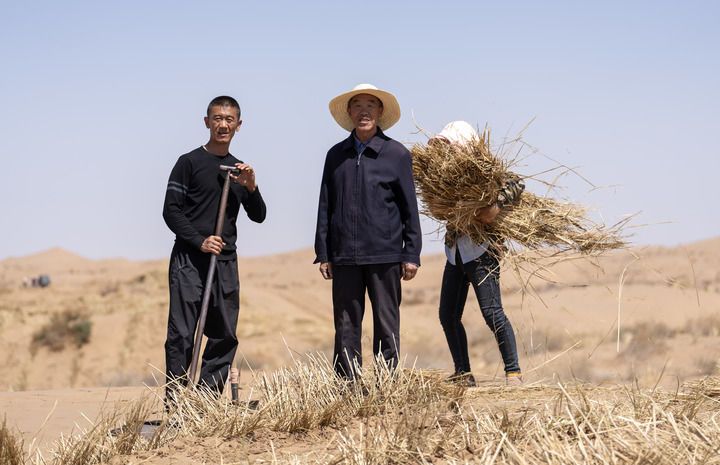 2024 年4月10日,在古浪县八步沙林场麻黄塘沙区,八步沙第二代治沙人郭万刚(中)和郭玺(左)一起讨论治沙方案 费茂华摄