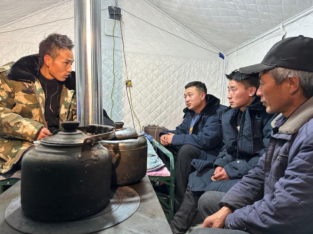 2023年12月21日,在帐篷里,柴永忠(右一)与儿子柴成良(右二)和家里的亲戚讨论震后生活安排。新华社记者张文静 摄