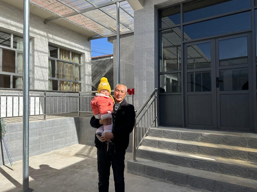 2025年1月18日,柴永忠抱着小孙子在新房前合影。新华社记者张文静 摄