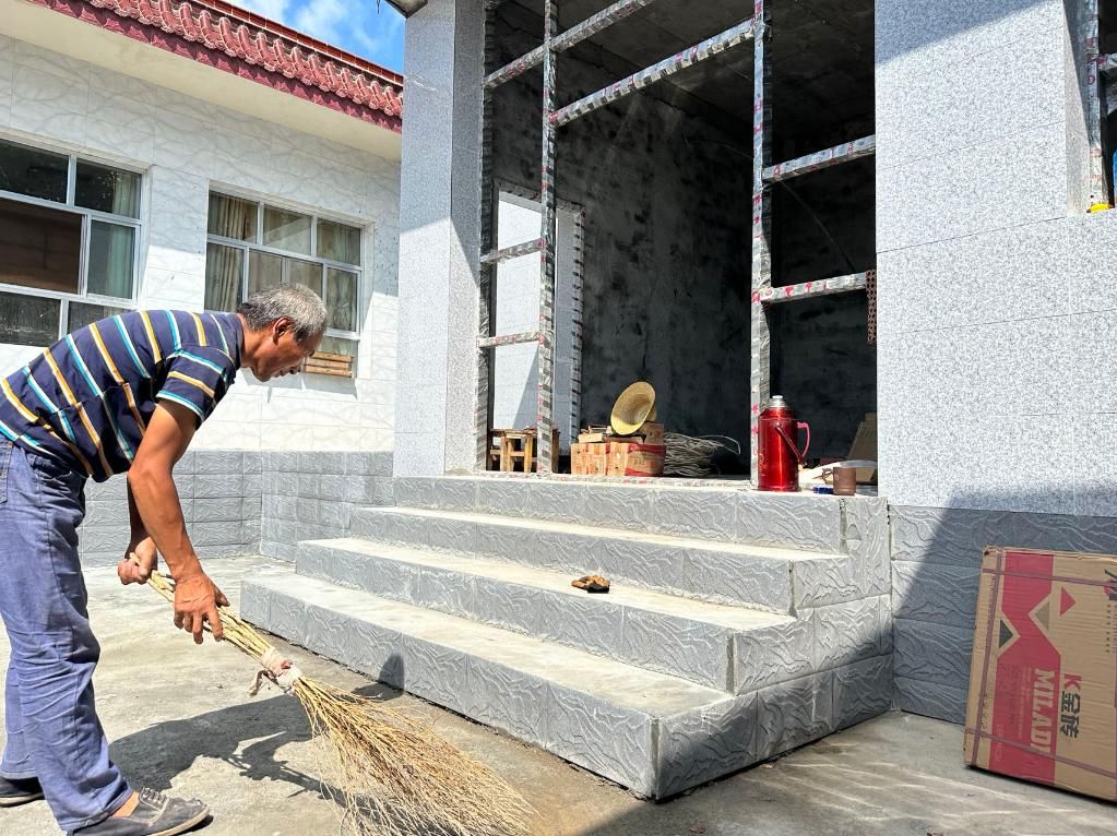 2024年9月3日,柴永忠在落成的新房主体前打扫卫生。新华社记者张文静 摄