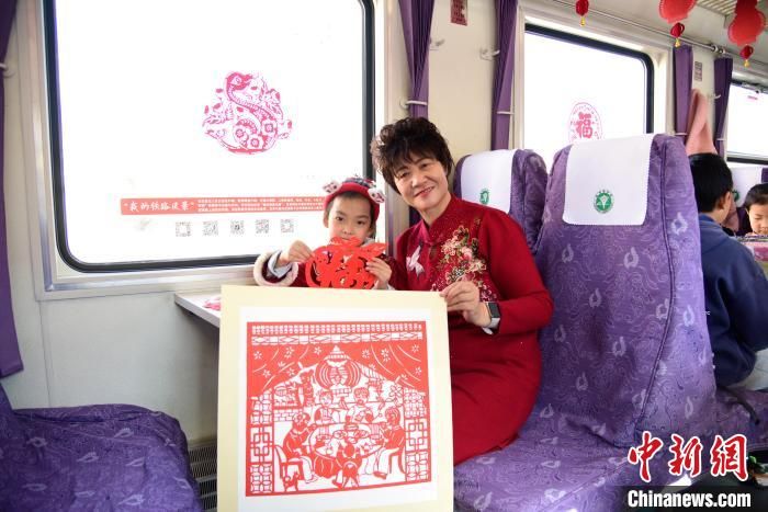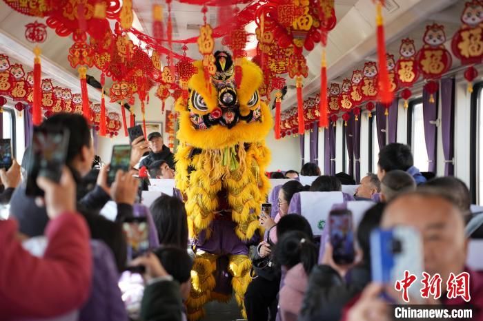 近日,在穿行于甘肃省白银市境内红会铁路支线上的7515/16次“慢火车”上,一场别开生面的“非遗迎春,福载归程”活动温暖上演,舞狮表演、秦腔演唱、剪纸艺术展示,各种活动为旅客们的归乡之旅增添了别样的温馨与文化韵味。同样的表演在甘肃省定西市陇西县开往青林的7504/3次“富民号”公益性“慢火车”上继续精彩上演,陇西车务段7504次列车组织以“传播非遗文化,慢火车上年味浓”为主题的列车文化惠民活动,秦腔剧目《花亭相会》表演赢得了旅客的喝彩和称赞。图为秦腔表演《花亭相会》。王光辉 摄