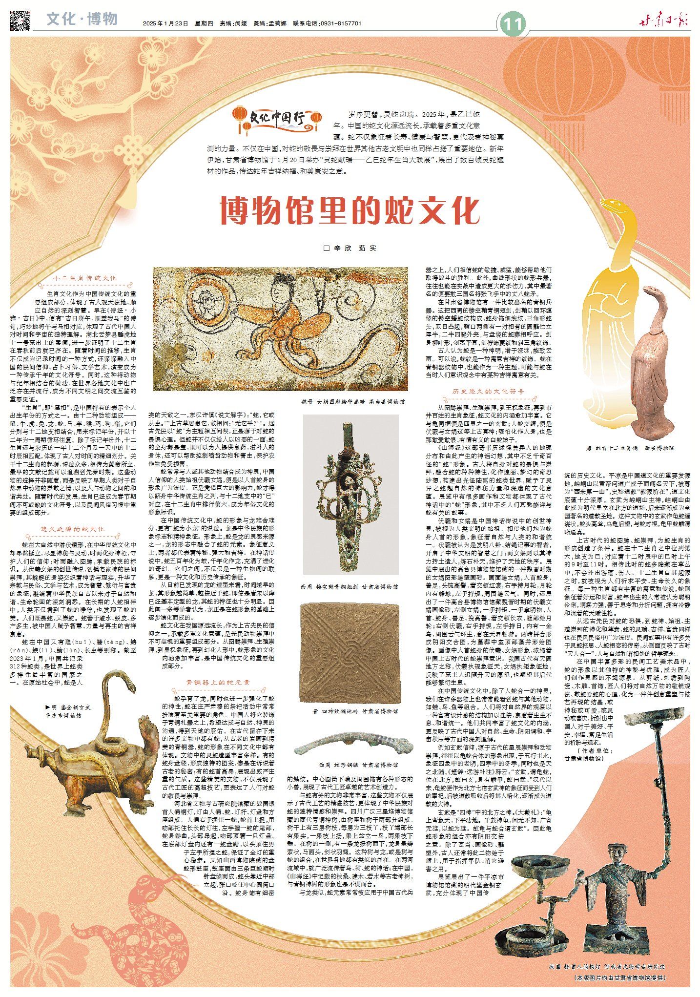 岁序更替,灵蛇迎瑞。2025年,是乙巳蛇年。中国的蛇文化源远流长,承载着多重文化意蕴。蛇不仅象征着长寿、健康与智慧,更代表着神秘莫测的力量。不仅在中国,对蛇的敬畏与崇拜在世界其他古老文明中也同样占据了重要地位。新年伊始,甘肃省博物馆于1月20日举办“灵蛇献瑞——乙巳蛇年生肖大联展”,展出了数百帧灵蛇题材的作品,传达蛇年吉祥纳福、和美康安之意。