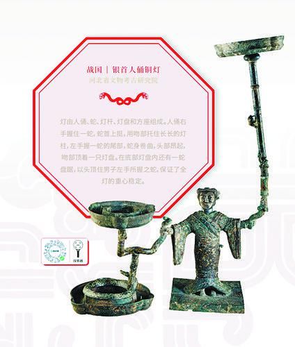 河北省文物考古研究院馆藏的战国银首人俑铜灯,灯由人俑、蛇、灯杆、灯盘和方座组成。人俑右手握住一蛇,蛇首上挺,用吻部托住长长的灯柱,左手握一蛇的尾部,蛇身卷曲,头部昂起,吻部顶着一只灯盘。在底部灯盘内还有一蛇盘踞,以头顶住男子左手所握之蛇,保证了全灯的重心稳定。又如山西博物院藏的盘蛇形鼓座,鼓座面由三条巨蛇顺时针盘绕而成,蛇头靠近中部立起,张口咬住中心圆筒口沿。蛇身饰有细密的鳞纹。中心圆筒下端及周围饰有各种形态的小兽,展现了古代工匠卓越的艺术创造力。