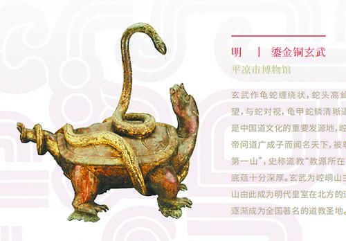 展览展出了一件平凉市博物馆馆藏的明代鎏金铜玄武,充分体现了中国传统的历史文化。平凉是中国道文化的重要发源地,崆峒山以黄帝问道广成子而闻名天下,被尊为“西来第一山”,史称道教“教源所在”,道文化底蕴十分深厚。玄武为崆峒山主神,崆峒山由此成为明代皇室在北方的道场,后来逐渐成为全国著名的道教圣地。这件文物中的玄武作龟蛇缠绕状,蛇头高耸,乌龟后望,与蛇对视,龟甲蛇鳞清晰逼真。