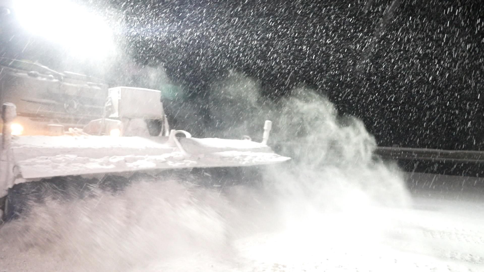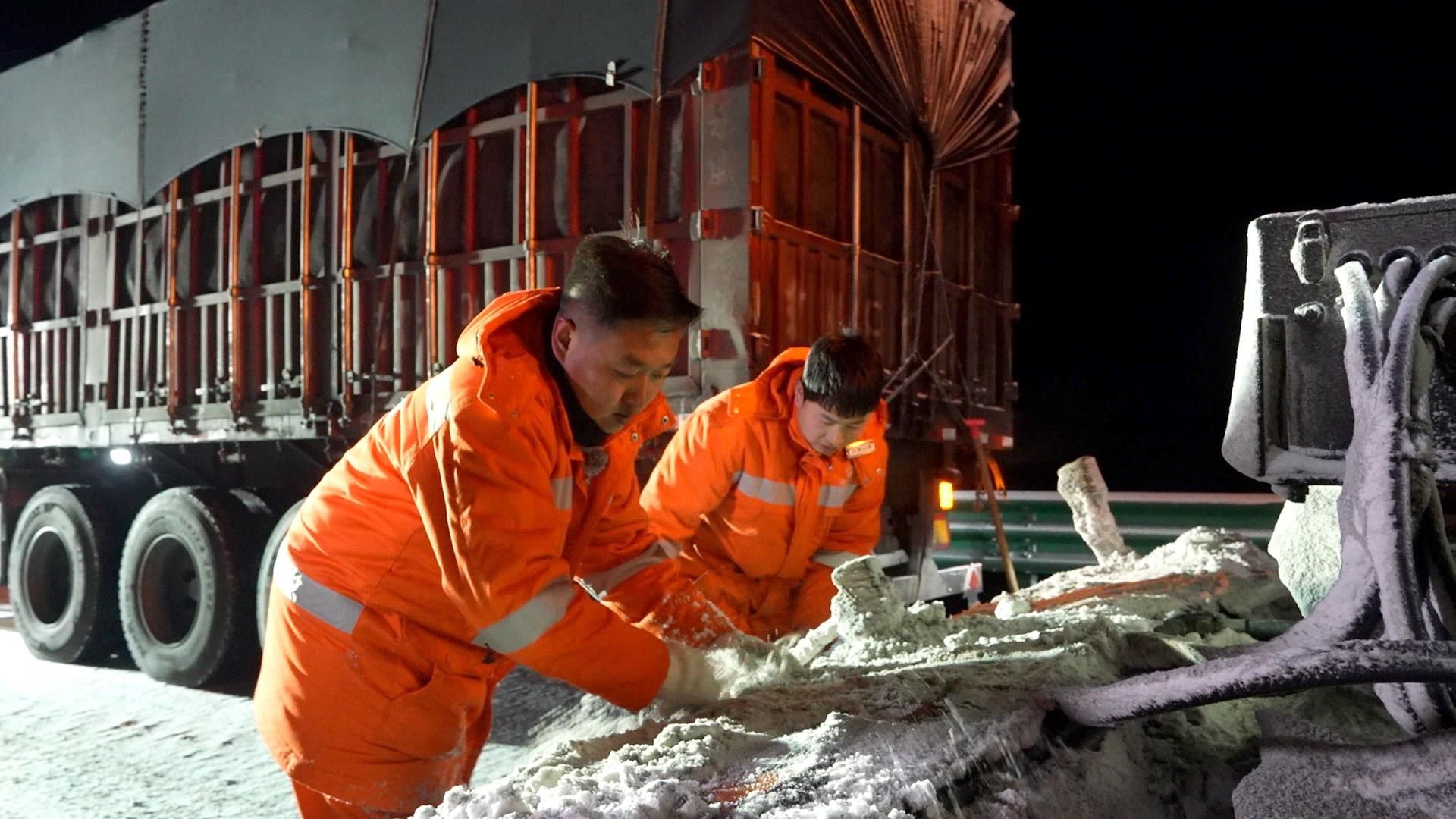 大货车打滑熄火,记者步行都极易摔倒。23名公路人紧急出动,大型除雪车、破冰车、融雪剂撒布车不间断作业。